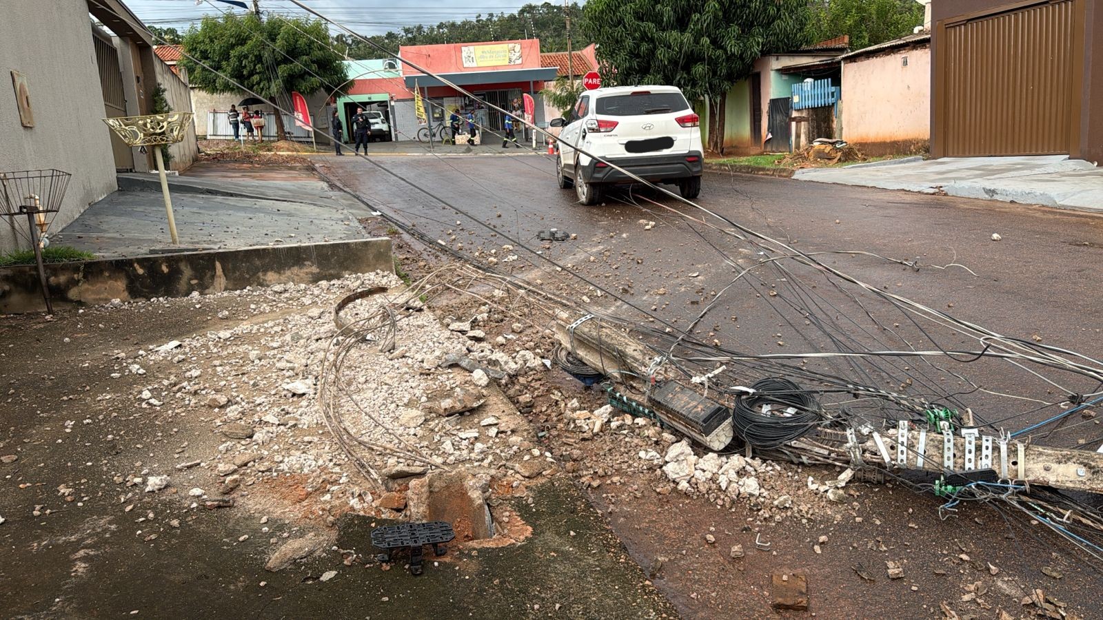 Além disso, outro poste de alta tensão também foi danificado. Ele não chegou a cair porque ficou sustentado pela fiação elétrica, mas apresenta risco e aguarda reparos.