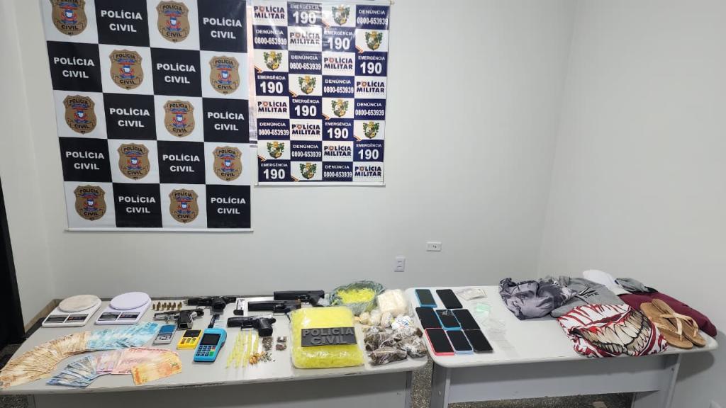 Foram apreendidos uma pistola calibre 380 com seis munições, uma pistola calibre 9mm com cinco munições, três simulacros de pistola, quatro papelotes e cinco porções de maconha, 27 pinos e dois invólucros de cocaína, 16 pinos e sete porções de pasta base e R$ 3.378 em espécie.